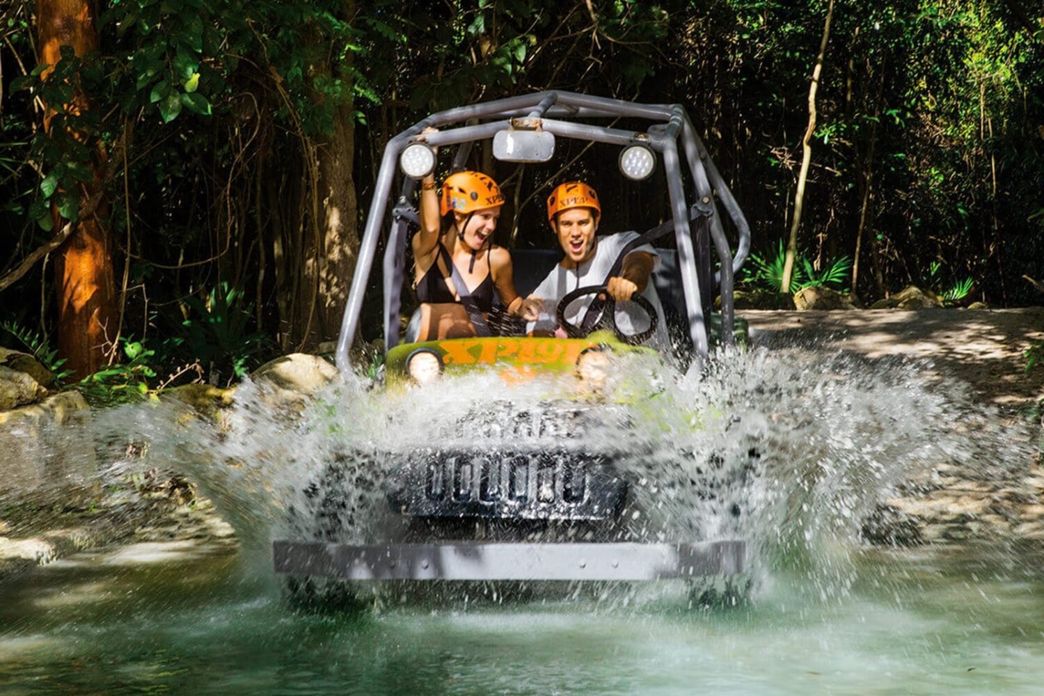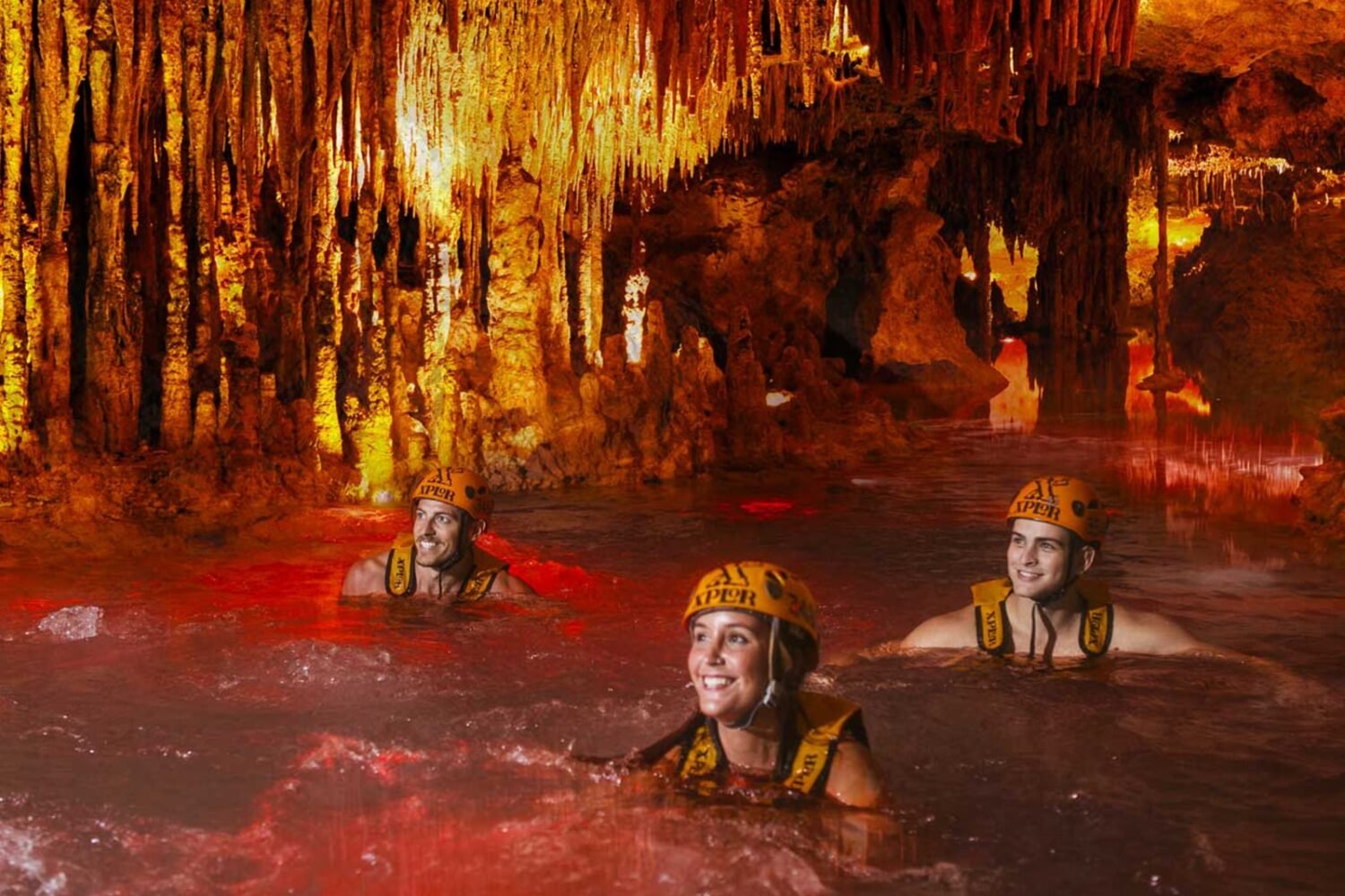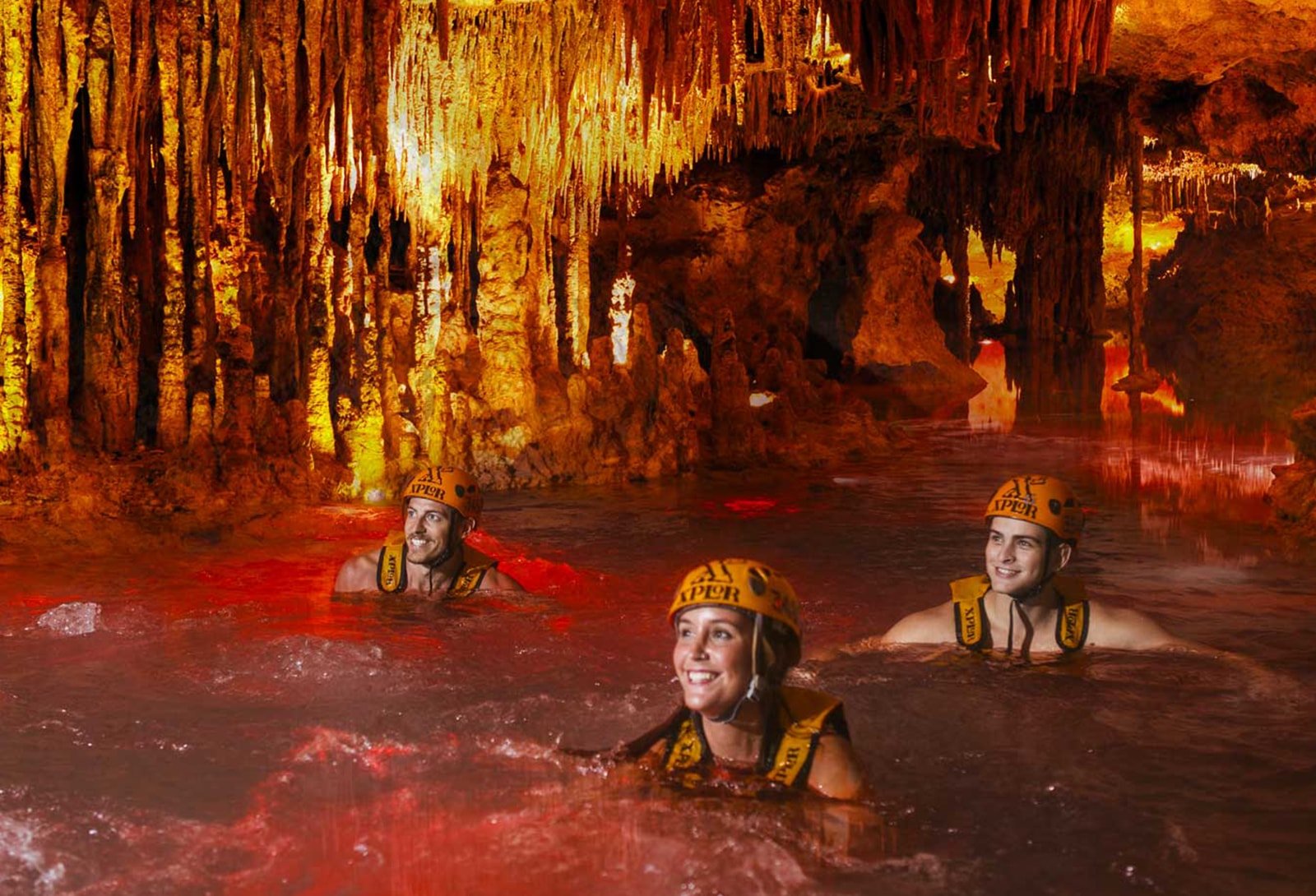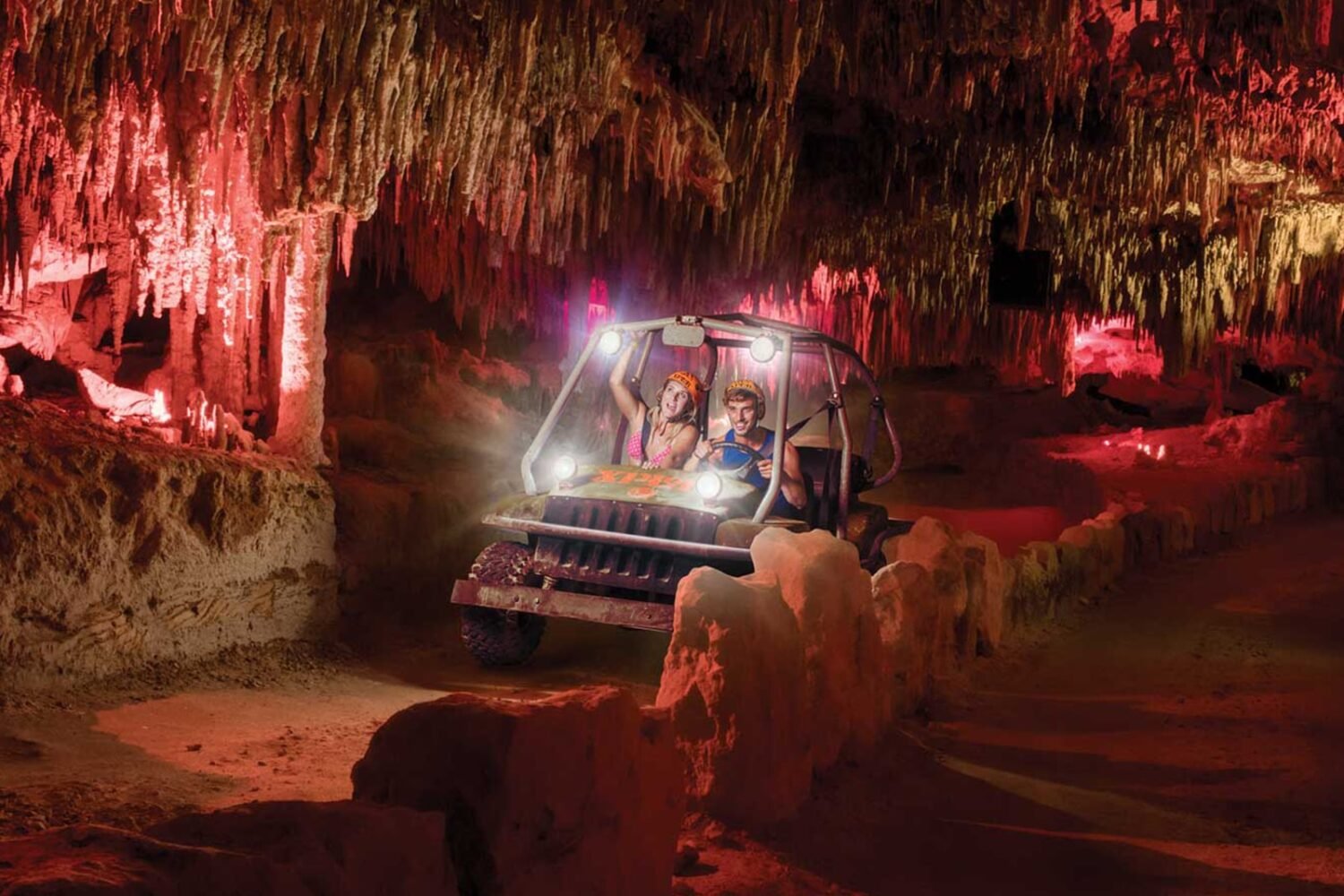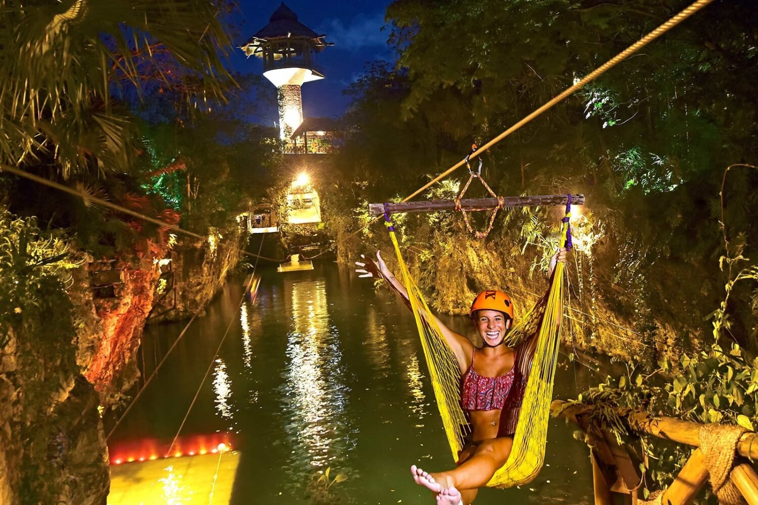 Vive la intensidad de la noche deslizándote en increíbles tirolesas rodeado del cielo estrellado, maneja por la selva en vehículos anfibios, recorre cavernas misteriosas y sumérgete en las refrescantes aguas de un río subterráneo.